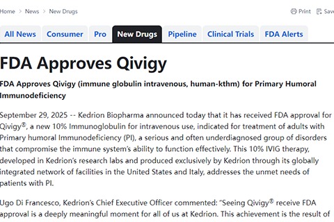 Kedrion Biopharma生物制药宣布,其新型10%静脉注射用人免疫球蛋白Qivigy®已获得美国FDA批准。该药适用于治疗成人原发性体液免疫缺陷(PI),这是一类严重且常被漏诊的疾病,会损害免疫系统的有效功能。