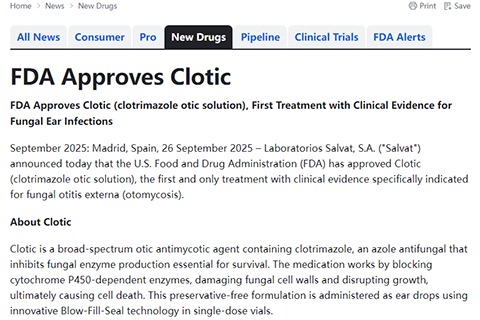 摘要:2025年9月26日,西班牙马德里,Laboratorios Salvat,S.A.今日宣布,美国食品药品监督管理局已批准Clotic(克霉唑滴耳液),这是首个也是目前唯一一个拥有临床证据、专门适用于真菌性外耳道炎的治疗药物。
