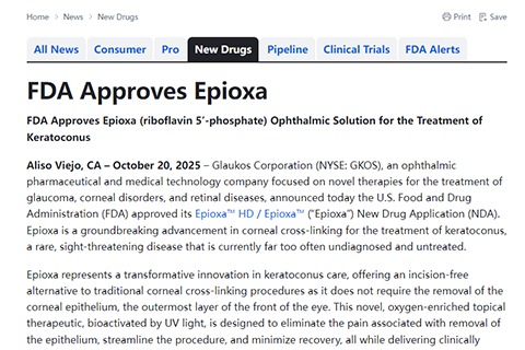 专注于开发青光眼、角膜疾病和视网膜疾病新型疗法的眼科制药及医疗技术公司Glaukos Corporation今日宣布,其Epioxa™ HD/Epioxa™的新药申请已获得美国FDA批准。Epioxa是角膜胶原交联疗法治疗圆锥角膜领域的一项突破性进展。圆锥角膜是一种罕见且威胁视力的疾病,目前常常存在诊断不足和治疗不足的问题。