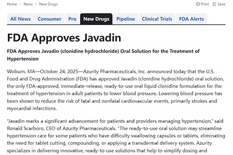 摘要:2025年10月24日 Azurity Pharmaceuticals,Inc.今日宣布,其Javadin(Clonidine Hydrochloride,可乐定盐酸盐)口服溶液已获得美国FDA批准。这是目前唯一一款获得FDA批准的、即用型速释可乐定口服液体制剂,用于治疗成人高血压患者以降低血压。降低血压已被证明可以降低致命和非致命性心血管事件(主要是中风和心肌梗死)的风险。