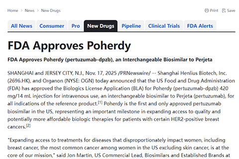 摘要:2025年11月17日 上海复宏汉霖生物技术股份有限公司与欧加隆公司今日联合宣布,美国食品和药物管理局已批准Poherdy的生物制品许可证申请。Poherdy是一款可与参照帕妥珠单抗(Perjeta)互换使用的生物类似药,获批用于参照药的所有适应症。