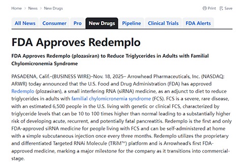 摘要:2025年11月18日 Arrowhead Pharmaceuticals,Inc.宣布,美国食品药品监督管理局(FDA)已批准Redemplo(plozasiran)作为饮食辅助手段,用于降低成人家族性乳糜微粒血症综合征(FCS)患者的甘油三酯。