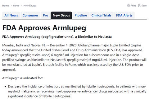 摘要:2025年12月1日,全球主要制药企业鲁宾有限公司今日宣布,美国食品药品监督管理局已批准Armlupeg™(pegfilgrastim-unne)6mg/0.6mL注射剂(单剂量预充式注射器,皮下注射),作为培非格司亭(Neulasta®)6mg/0.6mL注射剂的生物类似药。