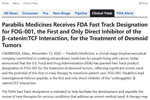 Parabilis Medicines是一家致力于为癌症患者创造非凡药物的临床阶段生物制药公司,今日宣布美国食品药品监督管理局已授予FOG-001治疗硬纤维瘤的快速通道产品资格。这反映了该领域显著的未满足医疗需求以及这款首创疗法改变患者护理标准的潜力。FOG-001是Parabilis的主要研究性Helicon肽,是首个且唯一直接抑制"不可成药"靶点——β-连环蛋白与TCF相互作用的药物。