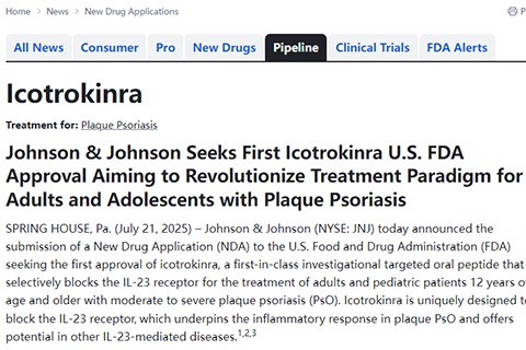 摘要:2025年7月21日 强生宣布,已向美国FDA提交了一份新药申请,寻求首次批准icotrokinra。该药是一种首创的研究性靶向口服肽,可选择性阻断IL-23受体,用于治疗12岁及以上成人和儿科患者的中度至重度斑块状银屑病。