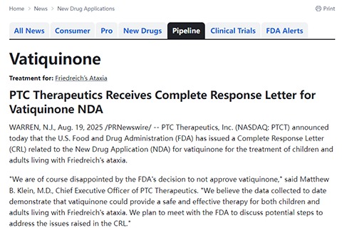 "我们对FDA决定不批准vatiquinone当然感到失望。"PTC Therapeutics的首席执行官Matthew B.Klein博士表示,"我们相信,迄今为止收集的数据表明,vatiquinone可以为患有弗里德赖希共济失调的儿童和成人提供一种安全有效的疗法。我们计划与FDA会面,讨论解决CRL中提出问题的潜在步骤。"