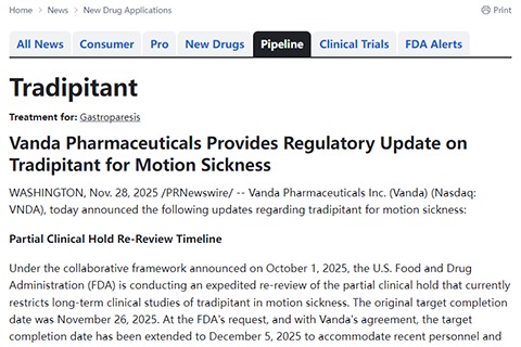 根据2025年10月1日宣布的合作框架,美国食品药品监督管理局目前正在对限制特拉匹坦用于晕动病的长期临床研究的部分临床搁置进行加速重新审查。原定的目标完成日期为2025年11月26日。