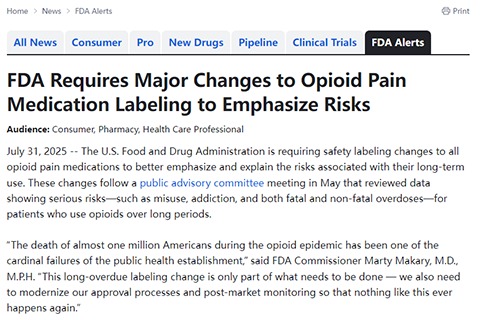 摘要:2025年7月31日 美国FDA正要求对所有阿片类止痛药进行安全性标签修改,以更明确地强调和解释与其长期使用相关的风险。这些变更是在5月举行公众咨询委员会会议后实施的,该会议审查的数据显示,长期使用阿片类药物的患者面临严重风险——如滥用、成瘾以及致命和非致命过量用药。