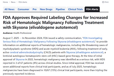 2024年11月,FDA曾发布安全通告《FDA调查Skysona治疗后血液恶性肿瘤严重风险》,提供关于早期活动性脑肾上腺脑白质营养不良患者接受Skysona(一种基于慢病毒的自体造血干细胞基因疗法)治疗后出现血液恶性肿瘤(包括危及生命的骨髓增生异常综合征和急性髓系白血病)的额外报告信息。
