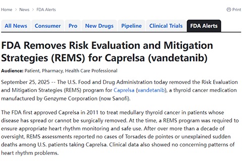 2025年9月25日,美国FDA取消了针对Caprelsa(凡德他尼)的风险评估与缓解策略计...【详情】