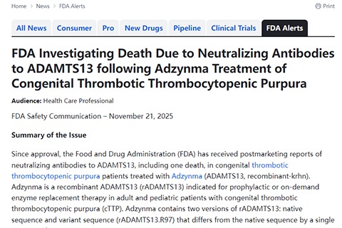FDA正在调查使用Adzynma治疗后产生中和抗体并导致严重(包括危及生命或致命)结局的风险,并正在评估是否需要采取进一步的监管措施。