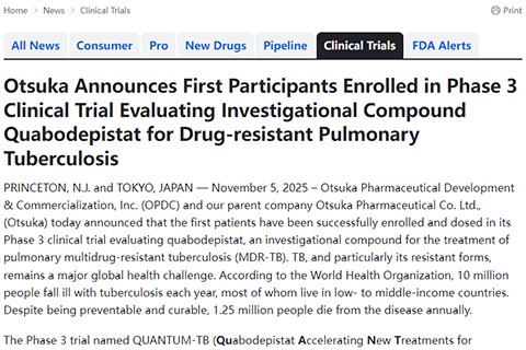 摘要:2025年11月5日 大冢药品开发与商业化有限公司及其母公司大冢制药株式会社今日宣布,评估研究性化合物quabodepistat用于治疗肺部多重耐药结核病的三期临床试验已成功完成首批患者入组并给药。