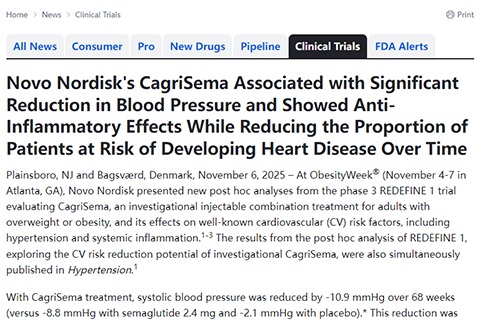摘要:2025年11月6日 在ObesityWeek®大会期间,诺和诺德公布了评估CagriSema的三期REDEFINE1试验的新事后分析结果。CagriSema是一种用于超重或肥胖成人的研究性注射组合疗法,新数据分析聚焦于其对高血压和全身性炎症等明确心血管风险因素的影响。