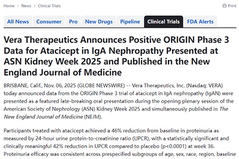 Vera Therapeutics,Inc.今日宣布,其atacicept用于治疗IgA肾病(IgAN)的ORIGINIII期试验数据,作为重磅最新突破性口头报告在美国肾脏病学会肾脏周2025的开幕全会上公布,并同步发表于《新英格兰医学杂志》。