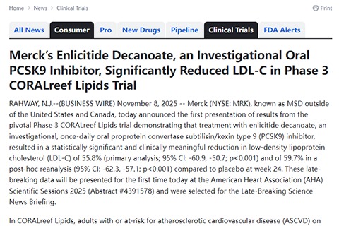 摘要:2025年11月8日 默沙东今日首次公布了关键性三期CORALreef Lipids试验的结果,数据显示,接受研究性每日一次口服PCSK9抑制剂enlicitide decanoate治疗,在第24周时与安慰剂相比,实现了具有统计学显著性和临床意义的低密度脂蛋白胆固醇降低,幅度达55.8%(主要分析),在事后重新分析中降幅达59.7%。