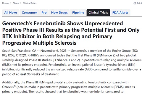 "Fenebrutinib显著降低了RMS的复发次数,并减缓了PPMS的残疾进展。这些前所未有的结果表明,fenebrutinib有潜力成为同类最佳的药物,作为针对RMS或PPMS患者的首个高效口服疗法,"基因泰克首席医学官兼全球产品开发负责人Levi Garraway博士表示。"因此,fenebrutinib的这些关键结果可能为MS患者带来新的希望,它们也重申了我们对于MS社区的持久承诺。"