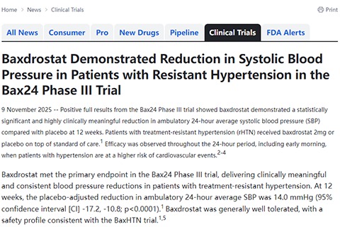 摘要:2025年11月9日 Bax24三期试验的完整阳性结果显示,与安慰剂相比,Baxdrostat在12周时实现了具有统计学显著性和高度临床意义的24小时动态平均收缩压降低。耐药性高血压患者在标准治疗基础上接受了Baxdrostat2mg或安慰剂治疗。