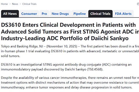 摘要:2025年11月10日 一项评估DS3610用于治疗晚期、转移性或不可切除实体瘤患者的首次人体一期试验已完成首例患者给药。 DS3610是一种研究性STING激动剂抗体偶联药物,其含有的免疫调节载荷由第一三共发现。