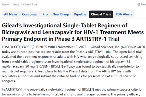 在ARTISTRY-1试验中,每日一次的BIC/LEN复方单片制剂达到了主要成功标准,即证明其不劣于基线时的多片抗逆转录病毒治疗方案。主要疗效终点是第48周时HIV-1RNA水平≥50拷贝/毫升的参与者百分比。在试验中,BIC/LEN总体耐受性良好,未发现显著或新的安全性问题。