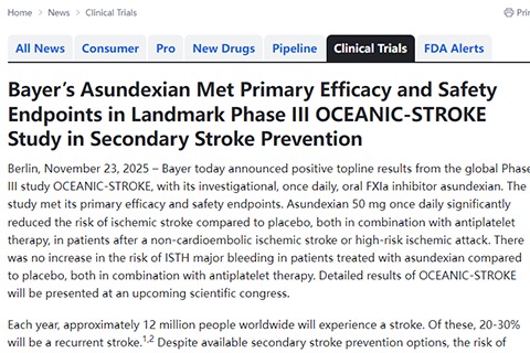 拜耳公布了其研究性、每日一次口服因子XIa抑制剂asundexian的全球III期OCEANIC-STROKE研究的积极顶线结果。该研究达到了其主要疗效和安全性终点。在非心源性缺血性卒中或高危短暂性脑缺血发作后的患者中,每日一次50mg的asundexian联合抗血小板治疗,与安慰剂联合抗血小板治疗相比,显著降低了缺血性卒中风险。与安慰剂联合抗血小板治疗相比,接受asundexian治疗的患者未出现ISTH大出血风险增加。OCEANIC-STROKE的详细结果将在即将举行的科学会议上公布。
