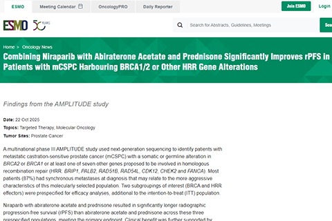 摘要:2025年10月22日 一项多国III期AMPLITUDE研究使用新一代测序技术,筛选出携带BRCA2或BRCA1体细胞或胚系突变,或至少一个其他被提议参与同源重组修复(HRR:包括BRIP1、PALB2、RAD51B、RAD54L、CDK12、CHEK2和FANCA)的七个基因之一的转移性去势敏感性前列腺癌(mCSPC)患者。