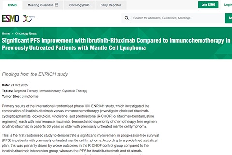 一项旨在研究伊布替尼-利妥昔单抗联合疗法对比免疫化疗(研究者选择利妥昔单抗-环磷酰胺-阿霉素-长春新碱-泼尼松[R-CHOP]或利妥昔单抗-苯达莫司汀方案,均联合利妥昔单抗维持治疗)的国际随机II/III期ENRICH研究的主要结果显示,在60岁及以上、既往未经治疗的套细胞淋巴瘤患者中,免化疗方案伊布替尼-利妥昔单抗显示出优越性。