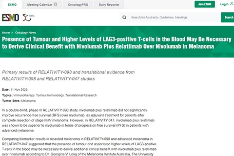 通过比较RELATIVITY-098(切除后辅助治疗)和RELATIVITY-047(晚期治疗)中的生物标志物结果,提示肿瘤的存在以及血液中与之相关的较高水平的LAG3阳性T细胞,可能是纳武利尤单抗联合瑞拉利单抗能够比单药带来额外临床获益的必要条件。该发现由澳大利亚悉尼大学、澳大利亚黑色素瘤研究所、皇家北岸医院及马特医院的GeorginaV.Long博士及其同事于2025年10月18日在《自然·医学》上发表,并同时在德国柏林举行的2025年欧洲肿瘤内科学会大会上以壁报形式展示。