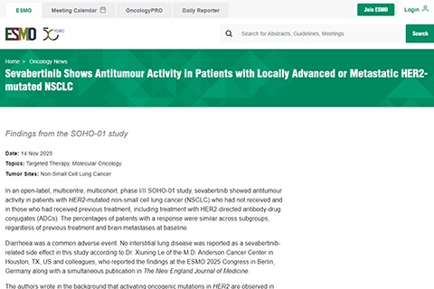 在一项开放标签、多中心、多队列的I/II期SOHO-01研究中,口服酪氨酸激酶抑制剂塞瓦贝替尼在携带HER2突变的非小细胞肺癌患者中显示出抗肿瘤活性,疗效覆盖既往未接受过治疗和已接受过治疗(包括接受过HER2靶向抗体药物偶联物治疗)的患者。各亚组患者的缓解率相似,不受既往治疗史和基线是否伴有脑转移的影响。