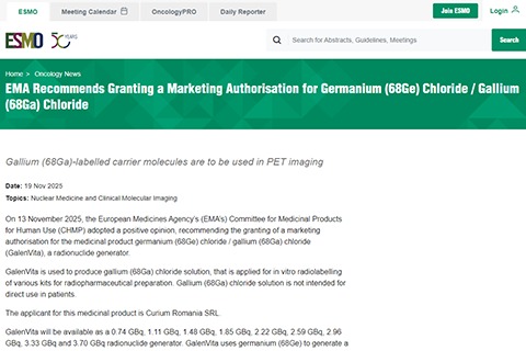 2025年11月13日,欧洲药品管理局的人用药品委员会通过了一项积极意见,建议批准药品氯化锗(68Ge)/氯化镓(68Ga)的上市许可。该药品的商品名为GalenVita,是一种放射性核素发生器。