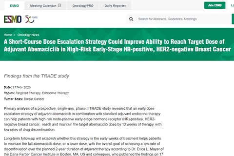 一项前瞻性、单臂、II期TRADE研究的主要分析显示,对于高危、淋巴结阳性的早期激素受体阳性、HER2阴性乳腺癌患者,采用早期剂量递增策略给予辅助阿贝西利联合标准辅助内分泌治疗,有助于患者在治疗12周时达到并维持阿贝西利的目标剂量,且药物停用率较低。