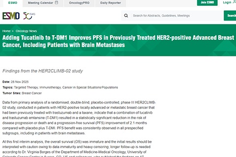 摘要:2025年11月28日 一项随机、双盲、安慰剂对照的III期HER2CLIMB-02研究的初步分析数据显示,对于既往接受过曲妥珠单抗和紫杉类药物治疗的HER2阳性局部晚期或转移性乳腺癌患者,图卡替尼联合曲妥珠单抗-美坦新偶联物的方案,与安慰剂联合T-DM1相比,显著降低了疾病进展或死亡的风险,并使中位无进展生存期延长了2.1个月。