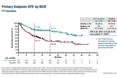 在KEYNOTE-905/EV-303试验中,抗体偶联药物与免疫疗法的联合方案在无事件生存期和总生存期方面显示出统计学显著且具有临床意义的改善。