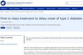 2025年11月14日 欧洲药品管理局(EMA)已建议在欧盟授予Teizeild(teplizumab)上市许可,用于延缓8岁及以上患有2期1型糖尿病的儿...【详情】